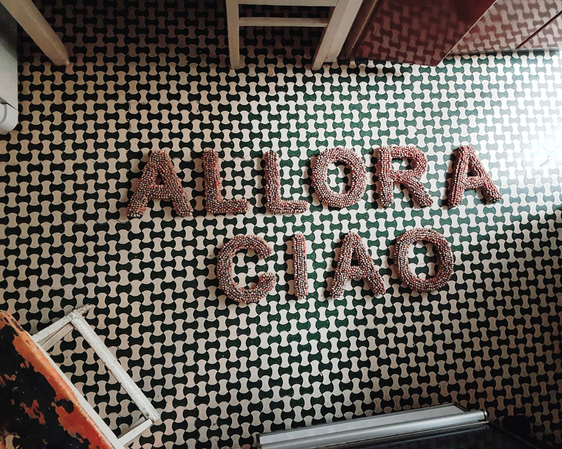 Il lavoro Allora ciao nasce in risposta all’invito di una mostra a Palermo il cui tema, per quanto possa sembrare curioso, era la porta. L’artista ha scelto di interpretare questo elemento non solo come soglia fisica, ma come spazio simbolico di passaggio, di incontro e di separazione. Allora ciao racchiude in sé l’ambivalenza del gesto del salutare, un dire “ciao” che può significare entrare o uscire, iniziare o concludere. L’opera è realizzata temperando la parte iniziale di migliaia di matite colorate, fino a ottenere una distesa di piccole cupole variopinte, che nella loro ripetizione formano una superficie vibrante e corale.