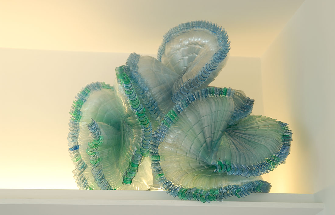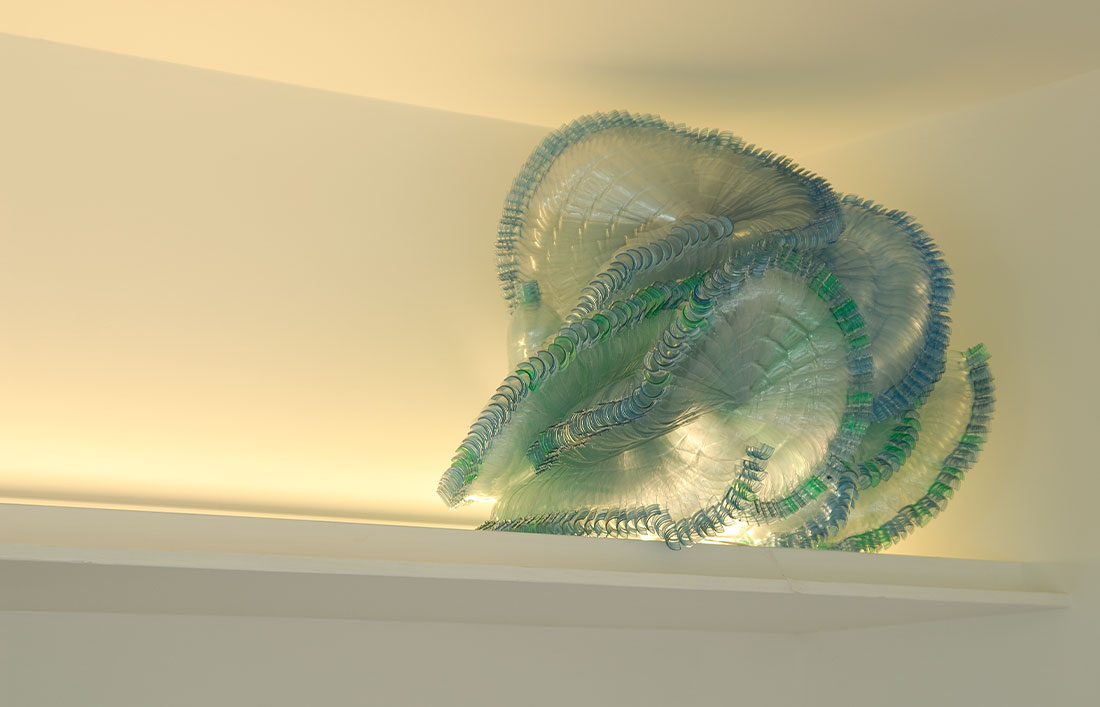 Questo corpus di opere nasce come tributo alla genialità di Roberto Capucci, Maestro capace di trasformare il tessuto in architettura e la moda in pura arte. L’ispirazione nasce dalla visita al suo atelier romano, luogo di bellezza e sperimentazione. Le opere reinterpretano le celebri sete plissettate di Capucci utilizzando bottiglie di plastica tagliate e cucite a mano, che riflettono la luce evocando le sue forme scultoree.Attraverso un gesto artigianale, il materiale di scarto si trasforma in scultura, elevando la plastica da simbolo di consumo a materia nobile. Ne nasce un dialogo tra memoria, contemporaneità e luce, in omaggio a chi ha fatto della forma e del colore un linguaggio universale.