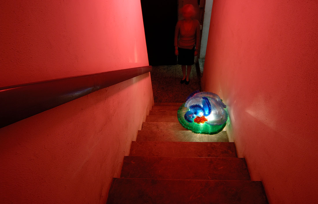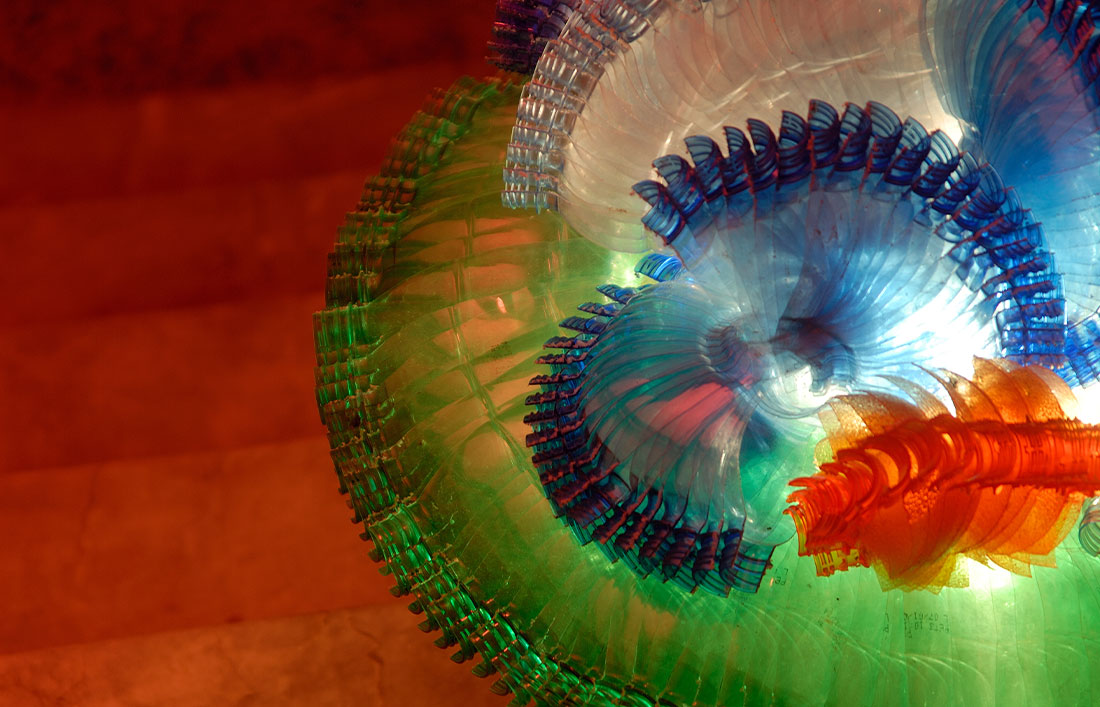 Nelle opere in omaggio a Roberto Capucci le tipiche sete plissettate trovano una reinterpretazione contemporanea attraverso un materiale umile e quotidiano: bottiglie di plastica, sezionate lavorate e cucite a mano con estrema precisione. Le raggere di plastica trasparente che catturano e riflettono la luce, evocano le pieghe scultoree dei celebri abiti del Maestro. Queste opere nascono da un gesto artigianale che eleva il materiale di scarto a nuova nobiltà, trasformandolo in scultura. Così, la plastica — simbolo per eccellenza del consumo e della precarietà — si rigenera in forma di arte, capace di dialogare con la memoria del lavoro di Capucci e con l’estetica del contemporaneo; è sia corpo che leggerezza della luce inchinandosi a chi ha saputo fare della forma e del colore un linguaggio universale.