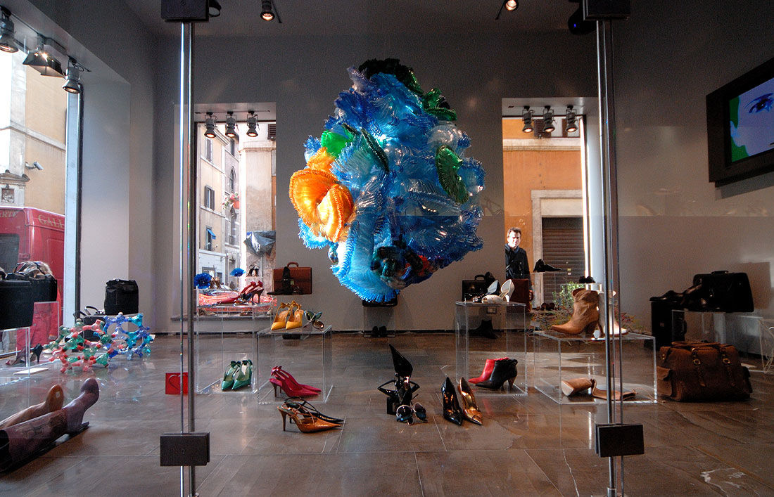 Un lavoro della serie in omaggio a Roberto Capucci sospeso in una vetrina di un negozio di scarpe.