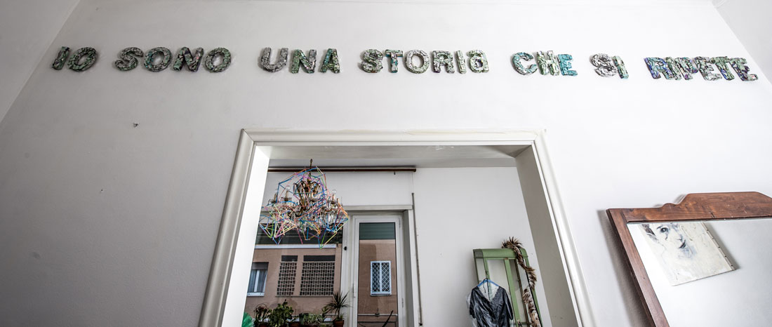 IO SONO UNA STORIA CHE SI RIPETE è una scritta murale di natura autobiografica, realizzata con frammenti di vecchi CD provenienti da un ufficio, oggetti ormai obsoleti, testimonianze materiali di un’epoca recente ma già trascorsa. I cd sono sezionati e ricompomposti in un mosaico luminoso e irregolare, restituendo vita a ciò che era destinato al silenzio e all’oblio. La frase, semplice e diretta, assume il tono di un’autoaffermazione e, al tempo stesso, di un epitaffio: parla di sé, ma anche dell’umano in generale. In essa si riflette la consapevolezza che ogni esistenza, ogni gesto, ogni civiltà tende a ripercorrere i propri cicli, a reiterare errori e desideri, a rispecchiarsi nel tempo. La frase installata a parete diventa un atto di confessione e di specchio collettivo. È il racconto di un “io” che riconosce di non essere unico, ma parte di un flusso che si ripete. È memoria e monito, vanità e consapevolezza.
