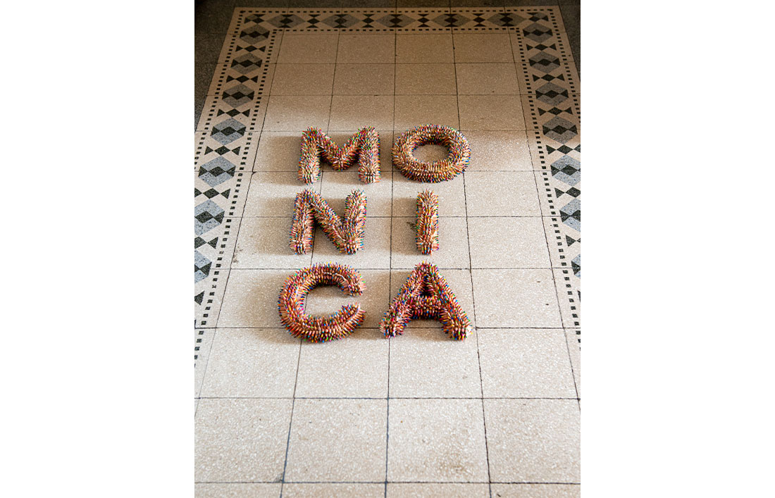 L’opera nasce come dono d’amore: un uomo regala alla sua compagna il suo nome, Monica, trasformandolo in forma visiva e materica. Le lettere del nome sono costruite con le punte di matite pazientemente temperate. Il nome, così composto, si carica di un doppio significato: è suono e materia, evocazione e presenza. Per chi ha commissionato questo lavoro Monica non è solo un insieme di lettere, ma un richiamo sonoro che contiene la persona amata. Prima di ogni parola, c’è il nome; prima di ogni discorso, c’è la sua evocazione.