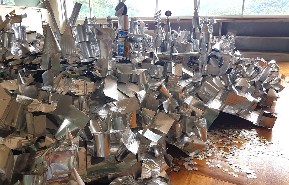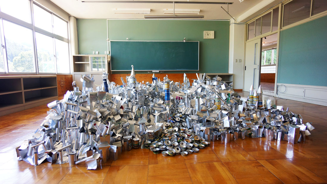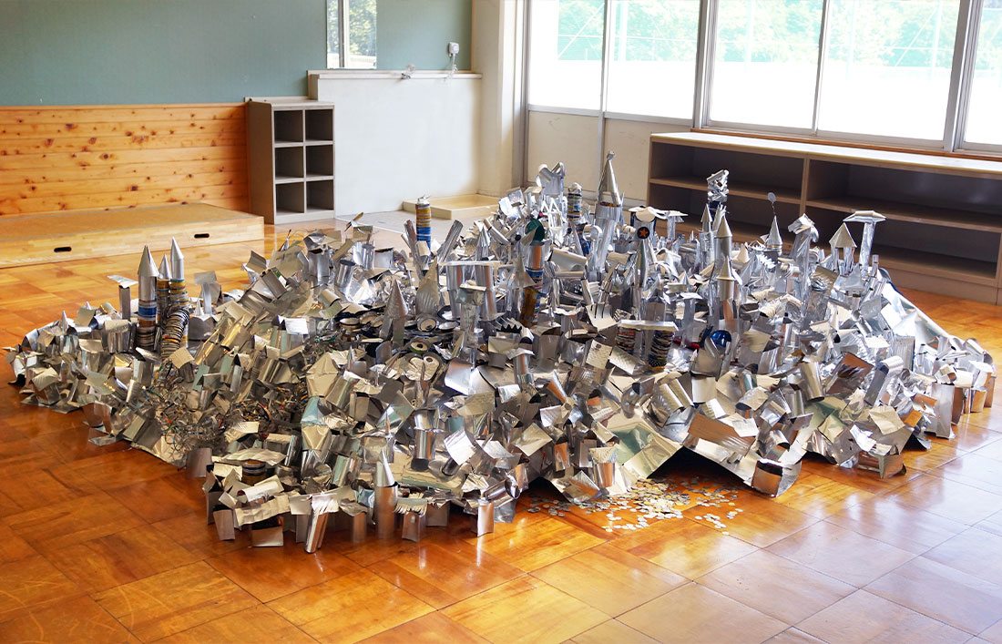 Realizzata in occasione della Biennale di Nakanojo, Living in a Box è un’installazione che prende forma all’interno di una scuola giapponese. L’opera rappresenta una città immaginaria costruita interamente con lattine di alluminio raccolte dagli abitanti del luogo e fornite in parte dal consorzio per il riuso degli imballaggi in alluminio (CIAL). Le piccole “case” di questa città si innalzano l’una sull’altra, compatte e prive di finestre, a comporre un paesaggio densamente stratificato, quasi claustrofobico. Nessuna presenza umana sembra potervi abitare. Questa configurazione volutamente chiusa e soffocante diventa metafora del vivere contemporaneo: un’esistenza compressa in spazi limitati, scandita da ritmi ripetitivi e dalla costante ricerca di equilibrio tra libertà e costrizione. Living in a Box invita a interrogarsi sul rapporto tra comunità, sostenibilità e modelli abitativi, proponendo una riflessione poetica e critica sul modo in cui costruiamo e abitiamo le nostre città interiori e materiali.