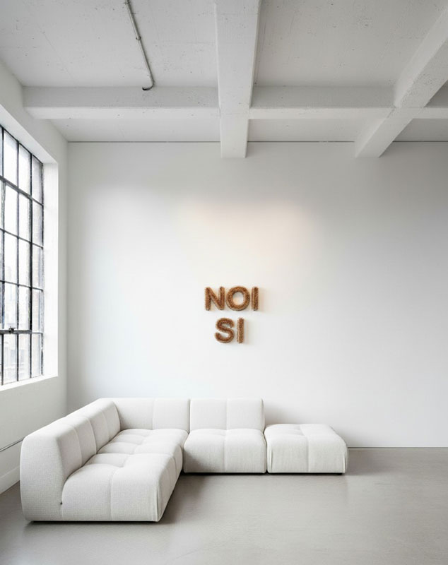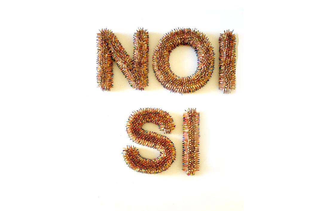 L’opera è una scritta murale composta da punte di matite temperate, la scritta, “NOI SI”, appare semplice, quasi enigmatica, ma racchiude una densità relazionale e simbolica. È un’affermazione che non nega, ma include: parla di appartenenza, di condivisione, di complicità silenziosa. Non descrive ciò che si è o ciò che si fa, ma afferma un’unità possibile, un consenso intimo che si costruisce nel non detto. In questa ambiguità risiede la forza dell’opera: essa custodisce un codice affettivo, una narrazione silenziosa che si offre allo sguardo ma non si concede del tutto alla comprensione. Il senso non è esplicito perché non deve esserlo: l’opera custodisce una lista invisibile di significati, che solo chi ne fa parte può decifrare. In questo modo, la scritta diventa un codice affettivo, una dichiarazione riservata ma universale.