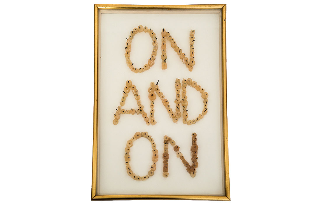 L’opera indaga il tema della ripetizione e della ciclicità del pensiero e delle azioni umane. La scelta dei mozziconi di candele, segni di una luce ormai consumata ma ancora presente diventa metafora della persistenza del gesto e dell’idea. ON AND ON racconta il tempo che ritorna su sé stesso, l’eterno scorrere dell’identico, in un equilibrio fragile tra fine e continuità.