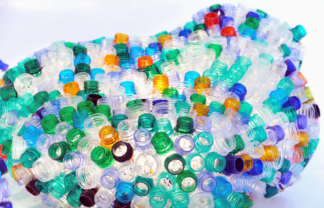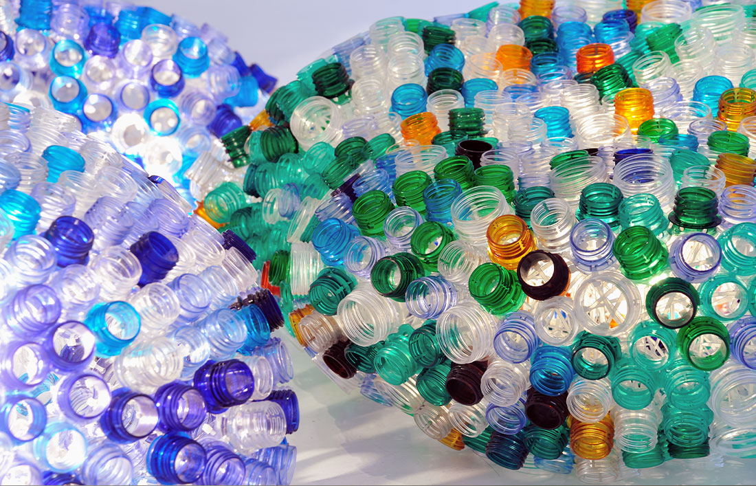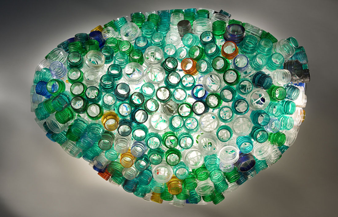 Una lampada realizzata cucendo insieme i colli di bottiglie di plastica, un ricamo tridimensionale, i fori della parte filettata delle bottiglie diventano piccoli diffusori di luce, attraverso cui il fascio luminoso filtra e si rifrange, creando un effetto visivo dinamico e giocoso. L’insieme dei colli forma una struttura traslucida e irregolare che crea un microcosmo sospeso tra natura e artificio.
