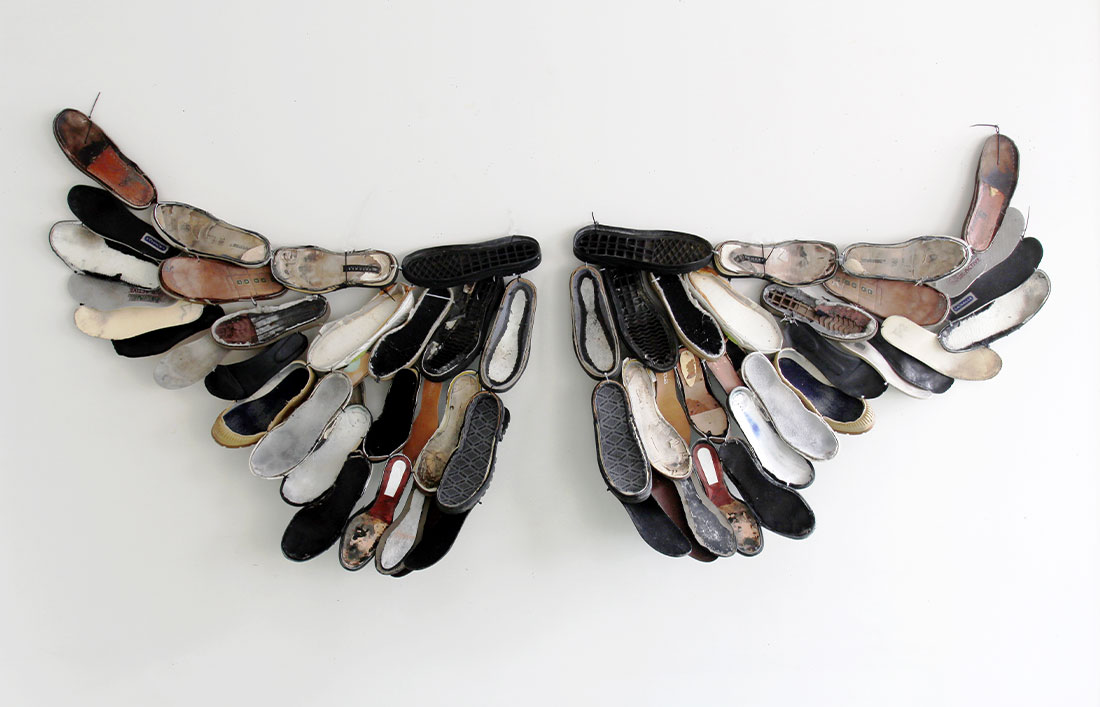 Questa scultura è stata commissionata da un designer di scarpe e raffigura due grandi ali realizzate con suole di scarpe usate, private della tomaia e assemblate. Materiale umile e consumato, la suola — simbolo del cammino e della fatica — diventa qui segno di rinascita e libertà. L’opera porta con sé anche un richiamo ai viaggi dei migranti, ai mucchi di scarpe abbandonate che spesso diventano testimonianza silenziosa di storie interrotte.Le suole, raccolte e ricomposte in un gesto di cura e memoria, si trasformano in ali di riscatto, come se quelle vite, quei percorsi di dolore e di ricerca, potessero finalmente spiccare il volo. In questa scultura convivono leggerezza e peso, caduta e ascesa.