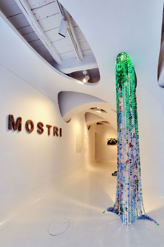 Born from five years of collection, the work is composed of plastic bottle necks, linked one by one to form a transparent column designed specifically for the Ex Elettrofonica space. The repetition of the gesture — collecting, preserving, assembling — transforms a discarded material into form and memory, bearing witness to how the act of reuse can become both a gesture and a reflection on the value of transformation. The column, slender and fragile, appears suspended between presence and absence.
