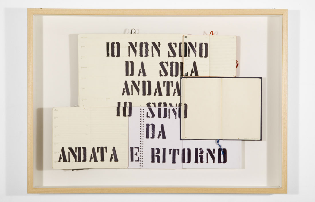 L’opera consiste in una teca che custodisce agende scadute, cucite insieme come frammenti di tempo passato. Provenienti dalla chiusura di una cartoleria, questi oggetti dismessi vengono rigenerati dall’artista: pagine che non tacciono e che comunicano ancora. Sulle agende campeggia la frase «Io non sono da sola andata, io sono da andata e ritorno», espressione di un tema centrale del lavoro dell’ artista: l’andare ed il tornare, il movimento ciclico, il ritorno come compimento del viaggio. L’opera è anche un atto di fiducia: uno slancio verso il futuro e l’ignoto, accompagnato dalla rassicurazione del ritorno, come un manifesto di un viaggio che non teme la partenza, perché sa del ritorno. L’opera diventa un gesto di cura verso ciò che è trascorso, un canto sommesso sull’eterno andare e tornare delle cose.