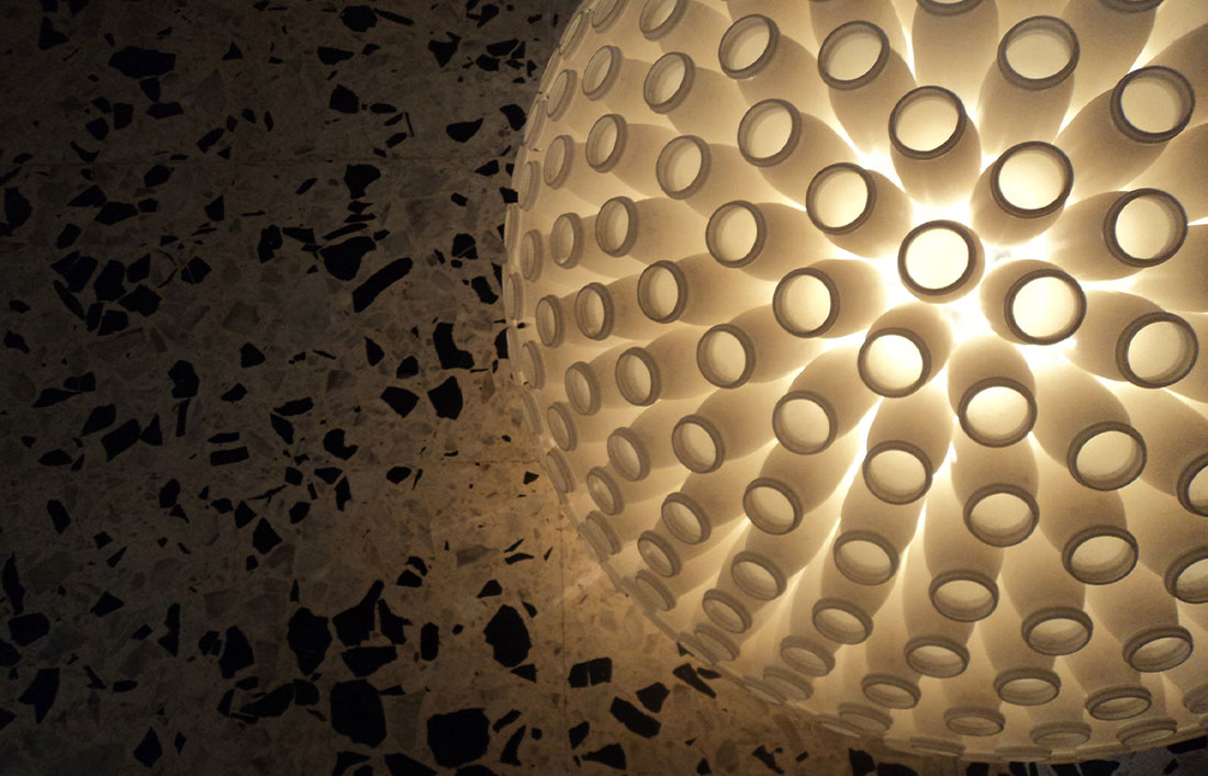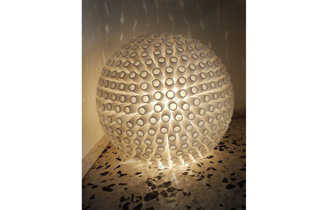 Frutto di una lunga raccolta di bottigliette di yogurt Actimel, questa lampada sferica invit alla riflessione sul tema della sovrapproduzione, sulla durata degli oggetti sulla responsabilità individuale. Ogni bottiglietta, originariamente destinata al consumo rapido e all’oblio, viene quì recuperata e riassemblata in una nuova forma organica e luminosa. Attraverso la ripetizione modulare l’artista restituisce dignità a un oggetto anonimo e seriale, ribaltando il suo destino di rifiuto.