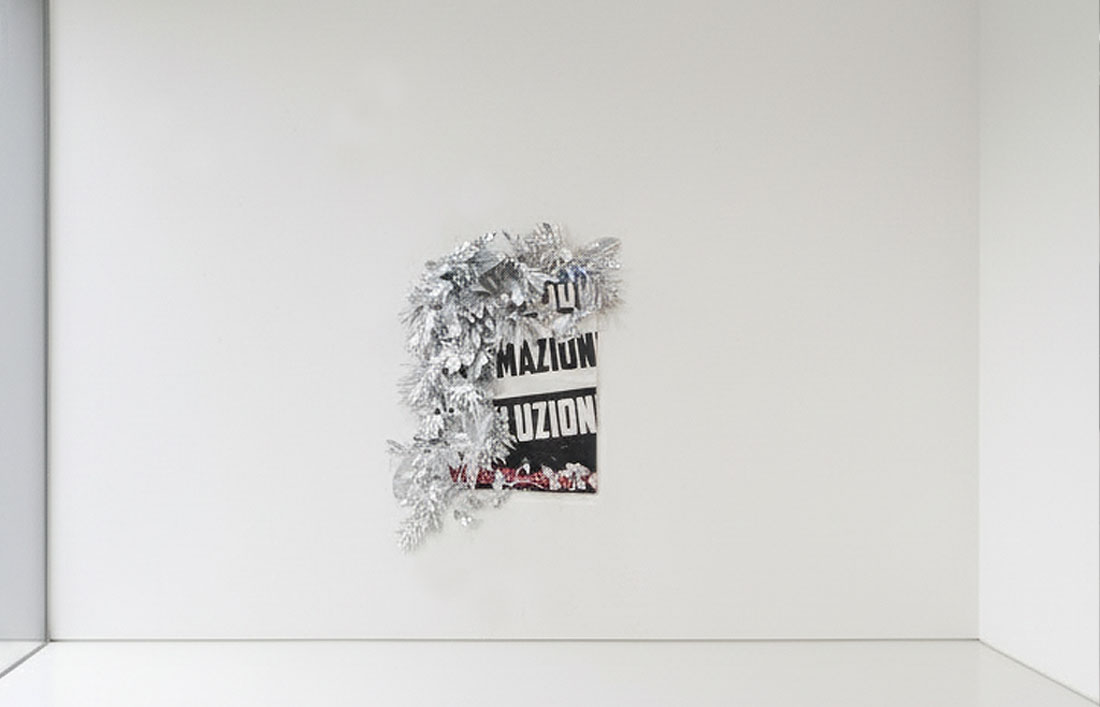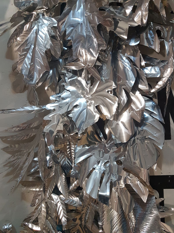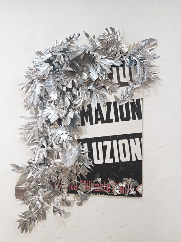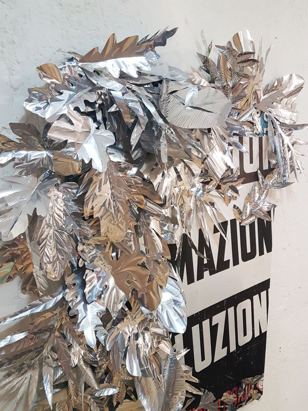 Il quadro rappresenta una “foresta impossibile” in cui convivono foglie appartenenti a climi e ambienti inconciliabili: specie tropicali e montane crescono fianco a fianco, realizzate con lattine di alluminio riciclate, tagliate e modellate in forme vegetali lucenti. Sullo sfondo si intravede un manifesto urbano prelevato dalla strada, recante slogan e simbologie riconducibili a gruppi di estrema destra. Questo elemento funge da base semantica e ideologica su cui interviene la proliferazione vegetale: le foglie metalliche si espandono progressivamente fino a oscurare e ricoprire le scritte, in un processo di cancellazione simbolica del linguaggio dell’intolleranza. L’opera costruisce così un dialogo tra natura e artificio, consumo e rigenerazione, proponendo una visione in cui la diversità — anche se impossibile o innaturale — diviene forza vitale capace di sovrapporsi e neutralizzare la rigidità ideologica del linguaggio politico. In tal senso, il quadro si pone come un atto di resistenza figurativa, in cui l’immaginario naturale, per quanto costruito e artificiale, diviene strumento di rigenerazione etica e visiva. La foresta impossibile, lucente e innaturale, non solo copre, ma ri-significa ciò che si trovava sotto di essa, proponendo una visione in cui la pluralità e la luce riflessa prevalgono sull’opacità del linguaggio dell’ odio.