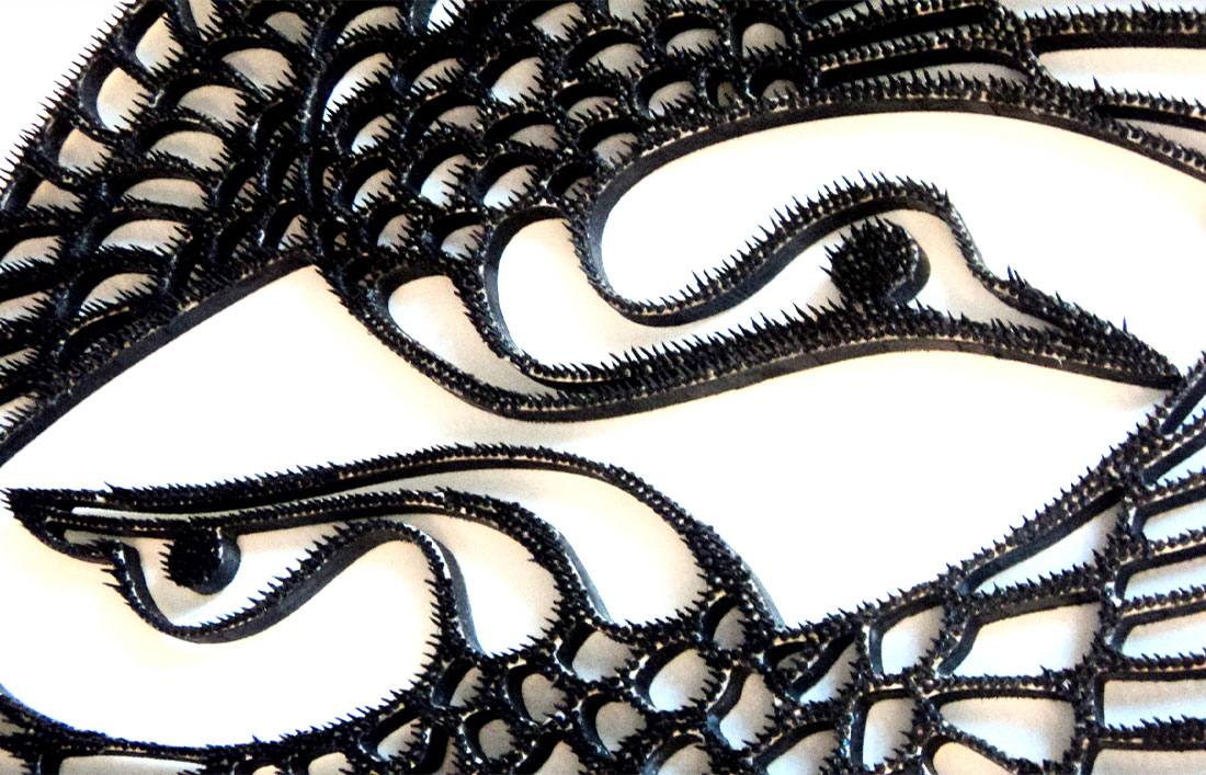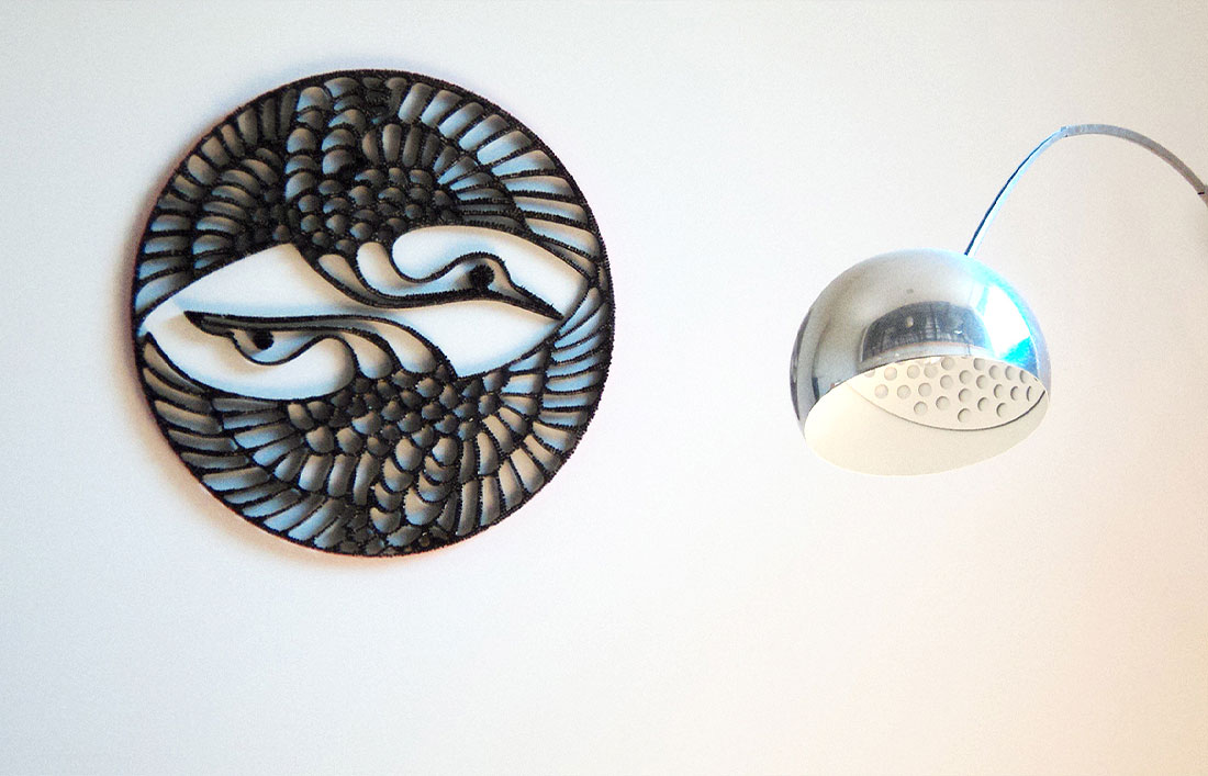 Un ricamo ligneo circolare, fitto di chiodi con la punta all’insù, disegna due gru specchiate all’interno di un cerchio, secondo uno stilema giapponese che evoca longevità ed equilibrio. Il lavoro minuzioso, quasi meditativo, trasmette la calma del gesto ripetuto, la precisione della tradizione artigiana e la tensione spirituale del simbolo orientale. Il contrasto tra legno e metallo, luce e ombra, crea un effetto yin e yang, dove la materia si fa simbolo di armonia.