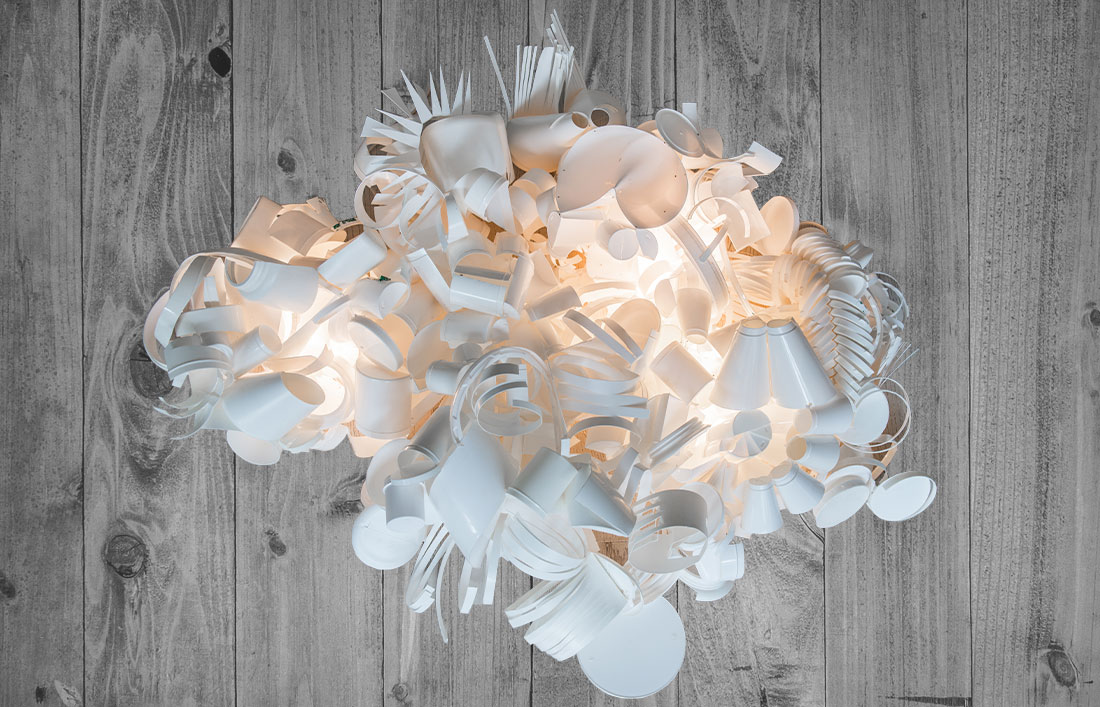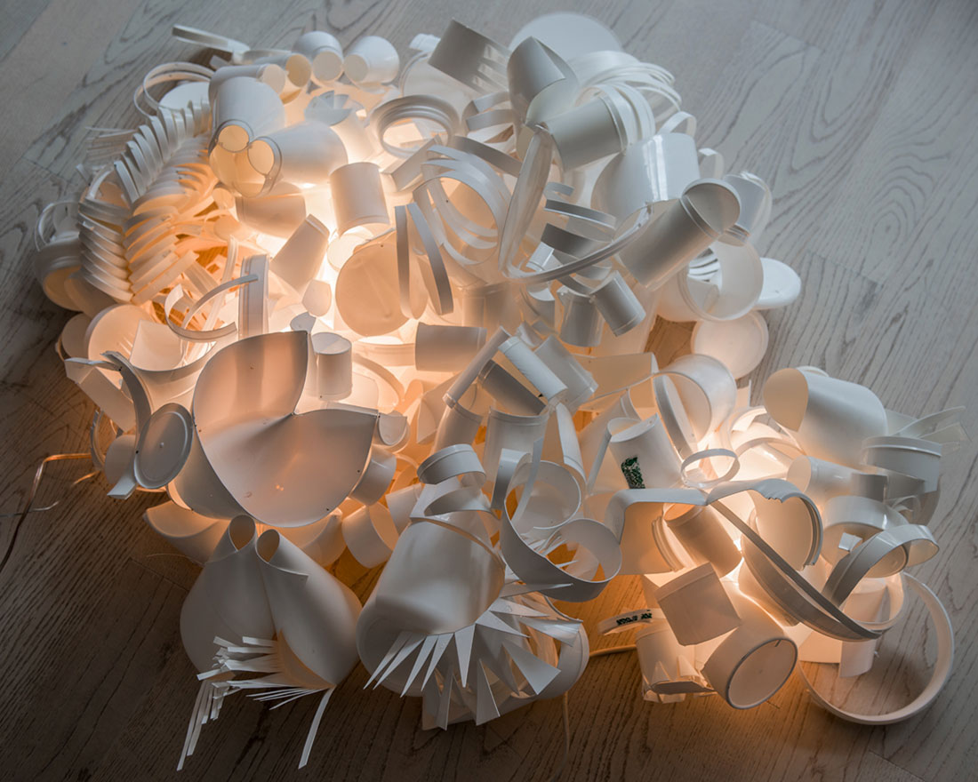 Questo lavoro nasce dal riuso di barattoli in plastica bianca, comunemente impiegati nelle farmacie. Attraverso tagli, incisioni e ricomposizioni dei vari contenitori – differenti per forma e dimensione – il materiale assume una nuova identità, trasformandosi in un corpo luminoso.