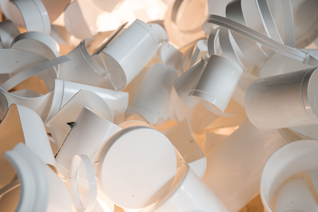 This work originates from the reuse of white plastic jars commonly used in pharmacies. Through cuts, incisions, and recompositions of the various containers—differing in shape and size—the material acquires a new identity, transforming into a luminous body.