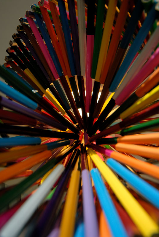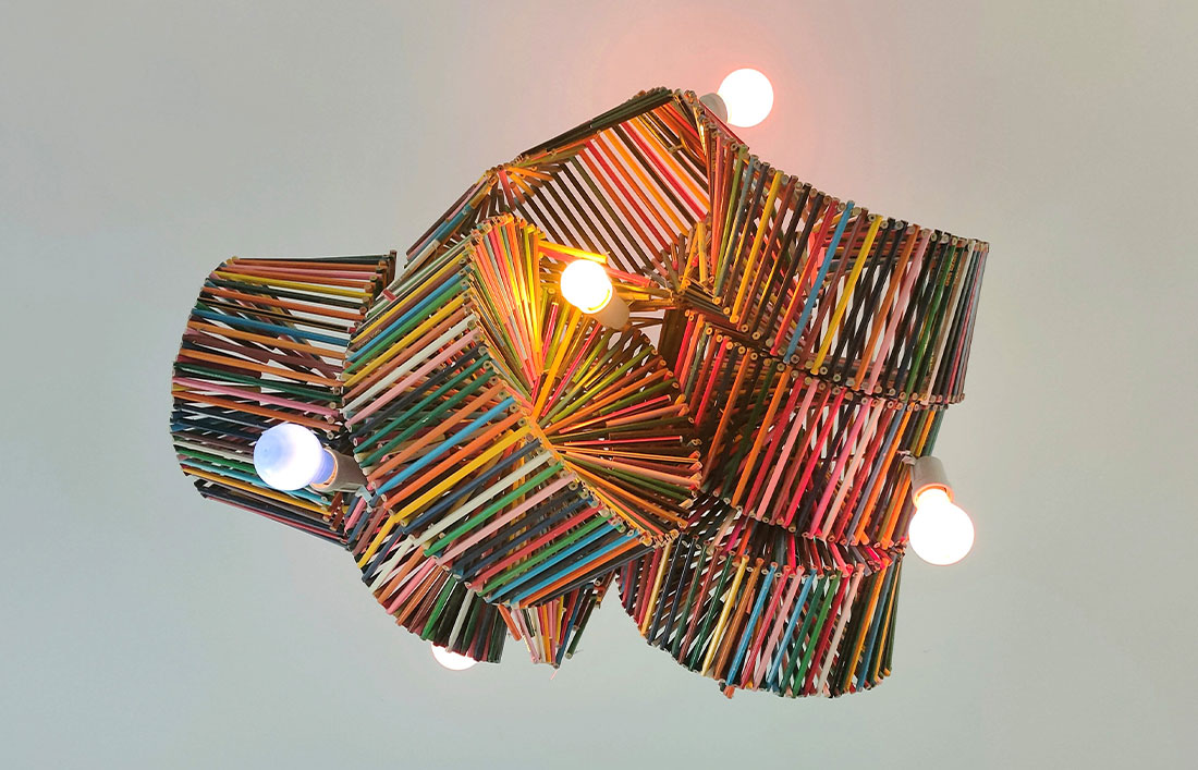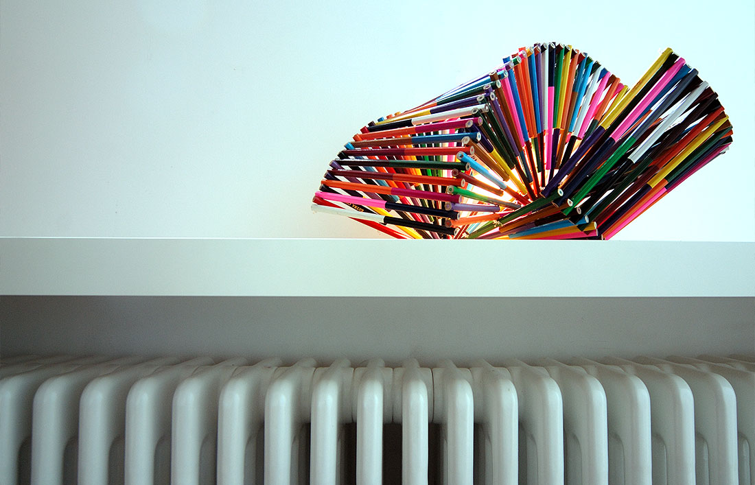 A luminous sculpture made of colored pencils, pierced and stitched together in radial patterns to form a self-supporting structure. The meticulous and patient work resembles a three-dimensional embroidery where color, light, and texture intertwine in a material and poetic composition.