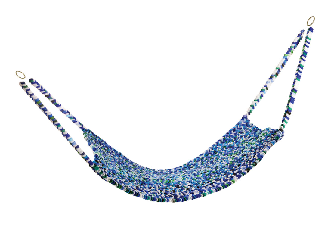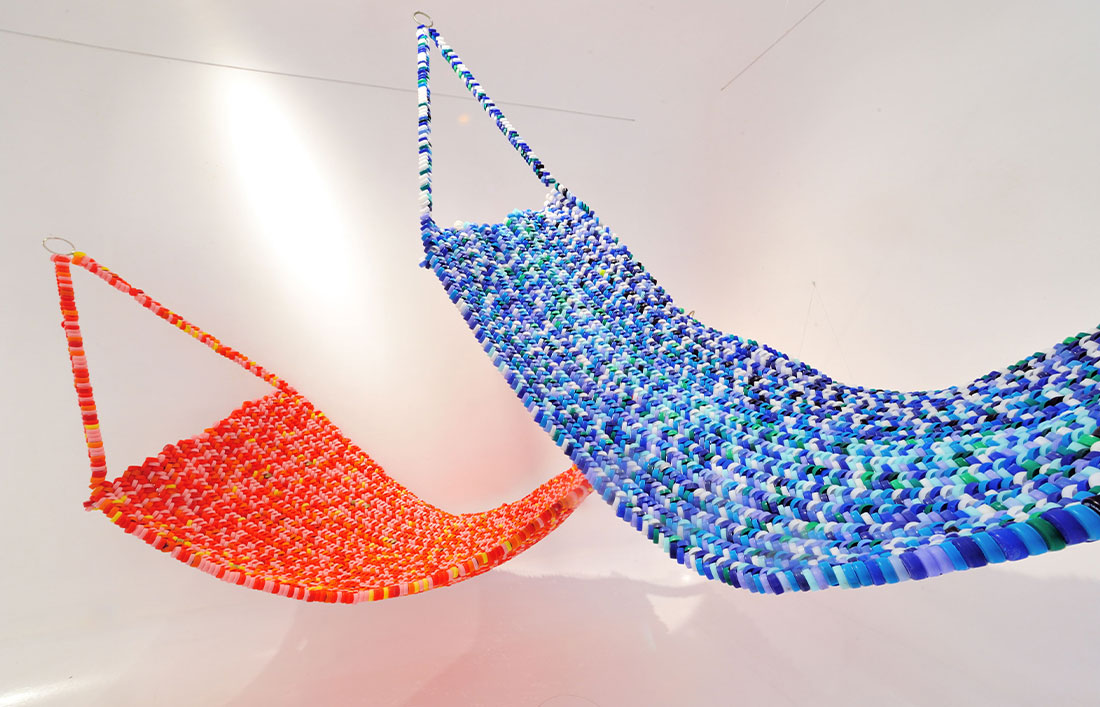 Questa installazione presenta due amache realizzate attraverso la tessitura di tappi di plastica raccolti nel corso di molti anni. Il lavoro nasce da un viaggio itinerante in Messico, dove la pratica del dormire in amaca e l’incontro con la tradizione artigianale delle “hamacas” hanno ispirato una riflessione sulla memoria e sul paesaggio culturale. La plastica, materiale eterno e simbolo della contemporaneità, sostituisce la fibra naturale e la scelta dei tappi di plastica come materiale di questa paziente tessitura è emblematica; l’oggetto quotidiano, scarto del consumo moderno, diventa struttura portante di un’opera che coniuga leggerezza e tensione.Le due amache, sospese nello spazio, dialogano tra loro e con lo spettatore, suggerendo un’esperienza di riflessione critica sul rapporto tra corpo, oggetto e ambiente.